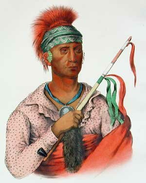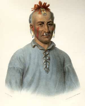 Another portrait of Chief Pontiac. Compare this one with the earlier one in headdress. Are these the same man? Portraits of famous Indians of the 18th and early 19th century are hard to authenticate. Tecumseh is another chief of which an authentic portrait cannot be verified with absolute certainty. Which is why we should be grateful to George Catlin, Paul Kane, and Charles Bird King for having provided authentic portraits of First Peoples some 150 years ago. |