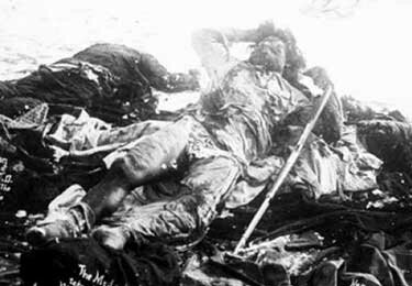Not even women and children were safe from the avenging wrath of invading racist settlers, genocidal local militiamen - like Col. Chivington of Colorado, who carried out the Sand Creek Massacre - and the heartless steamroller of the United States Army and its ruthless generals like Custer and Sheridan. No wonder American Indians sought a kinder, gentler place of refuge, Canada... Sadly, sometimes they weren't even safe there. The Cyprus Hills Massacre in 1873 was carried out by American wolfers who crossed the border to kill dozens of Indian men, women, and children, before scurrying back across to the US and safety... Canadian police tried to bring them to justice in Canada but were stymied by US officials. This US depredation actually motivated the Canadian Government to form the North West Mounted Police to patrol the area, and prevent future massacres, which though commonplace in the US, it did not want in Canada. Left and below disarmed Sioux men, women, and children lie frozen, shot to death, amid the ruins of their tent camp at Wounded Knee. |