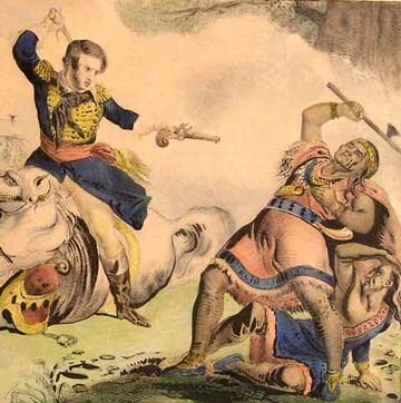 Almost from the beginning native people have been seen - at best - as a great inconvenience to Americans in their drive to create living space for white people. Today's American folk heroes, like Daniel Boone and Davy Crockett, were actually frontiersmen who fought Indians so they could steal their land and bring white settlers into Kentucky in the early 19th century. The success of this policy to wipe out the Indian was reflected in the literature of the time; an American classic "The Last of the Mohicans" could very well stand for the aim of the government's Indian policy of the time. It mirrored the quintessential American approach to the "noble Red Man" during the "building of America" from 1600 to 1900 - kill them wherever they got in the way of white development, then write about them, name rivers, towns, and counties after them. And celebrate - their passing... When small time private groups like those of Boone couldn't manage it, the American Army was used to do the job and teach the "noble Red Man" his place in the American scheme of things. Thousands of men, women, and children, were routinely massacred to make way for development. As late as December, 1890, the American Army used a machine gun to massacre some 300 helpless and freezing men, women, and children in the winter snows of Wounded Knee in South Dakota. Below the peaceful Chief Bigfoot shot and frozen.