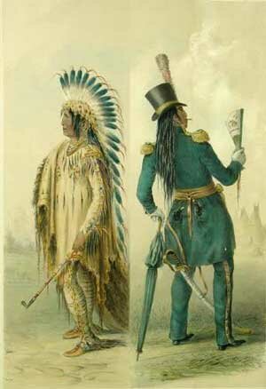 During the early exploration of Canada, Europeans traded cast metal beads made of silver, brass, and German silver to improve relations with First Nations people. Below Strutting Pigeon shows the variety of ways beads could be used on the head, neck, and clothing. |
