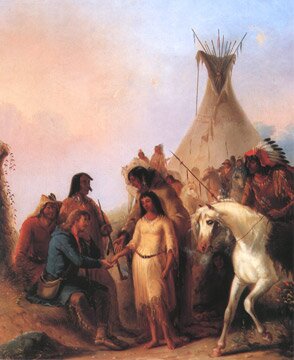 Europeans traveling in the wilds had to create alliances with First Nations people who knew and controlled the waterways and transportation routes. The coureurs-des-bois needed Indian women to cook, prepare their food supplies for winter, make and repair their clothes, heal their wounds, and especially to make their moccasins and snowshoes, which were essential for travel. Some of these relationships developed into families. The children of these unions, between French Canadians and their First Nations wives, would eventually become the Métis Nation of Canada. Métis comes from a French word meaning mixed. Sometimes the country wives stayed behind with the kids, while the voyageur returned home to Quebec, to return the next summer. Other voyageurs made a firmer commitment, and took jobs at the fur trade posts and stayed permanently. The Hudson's Bay Company saw this 'mixing' as bad for morals, while the North West Company saw it as good for business. But fur trade post chiefs from both companies took Indian wives, like those in Victoria, BC, Fort Edmonton, Winnipeg, and York Factory. These unions were looked on as entirely legal and moral among the First Nations people in the west. But more than one white man tried to hide the fact of his co-habiting with an Indian, from "the folks back home." Sir George Simpson, one of the most powerful men in Canada, dumped his country (Indian) wife, when he returned to Britain, so he could marry his cousin! |