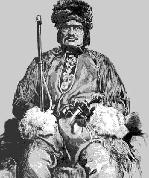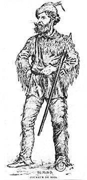 French Canadian Voyageurs were the main labour force for the fur trade of New France. They paddled the canoes, and carried the supplies and fur bales over the portages for the fur trading companies. When the French king made laws forbidding trading by anyone except the monopoly company, many young men broke the law, and moved out into the wilds to trade for furs. They became known as coureurs-des-bois (runners in the woods). The French Canadian coureurs-des-bois and voyageurs became known for their distinctive style of dress. A blue capote, a beaded pipe bag hung from a bright red sash, beaded moccasins and the inevitable pipe, became standard items. |