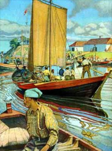 In 1821, the York boat grew to replace the canoe as the mode of transportation for the HBC. For over a century it became the main mode of transportation named after it’s ultimate destination, York Factory. The boat could carry more than 3 tons of goods; three times the capacity of a canoe. The boats were long and flat-bottomed, with a pointed bow and stern angled up at a forty-five degree angle, making it easy to beach off a sandbar. The oars were over 6 metres long, and each boat held six to eight oarsmen, who sat at the opposite side from the oar lock. Each man would stand up to push the oar forward and sit down to pull the stroke. When the river was shallow the boat was poled, when it ran fast the crew went ashore, and pulled the boat with ropes. When the wind was from behind, a square sail was used. For open water, the York boat was equipped with a mast, which could be dismantled. A typical boat was 12.6 metres in length, 9.1 metres to the keel and have an inside depth of 0.9 metres. Boats typically lasted about three years. |