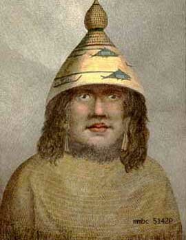 "Nootka" means "come around" in their native language. When James Cook first encountered them, they told him to "come around" with his ship to the harbour in their language, which he mistakened for their name. "Nuu-chah-nulth" means "all along the mountains", describing the habitat of their people. |