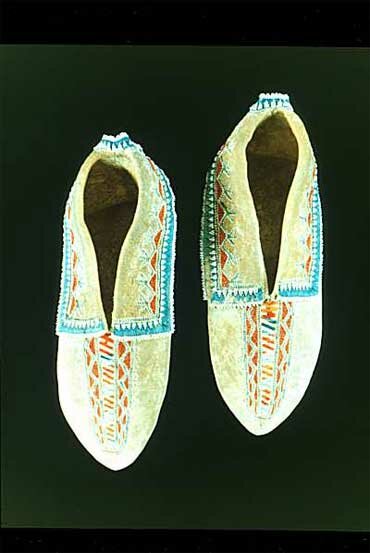 - Everyday footwear (although often going barefoot was easier), made from one piece of tanned and smoked hide seamed together at the heel and toe, with the top folded down to produce a cuff.