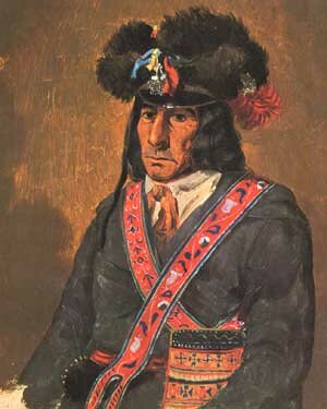French Canadian Voyageurs were the main labour force for the fur trade of New France. They paddled the canoes, and carried the supplies and fur bales over the portages for the fur trading companies. When the French king made laws forbidding trading by anyone except the monopoly company, many young men broke the law, and moved out into the wilds to trade for furs. They became known as coureurs-des-bois (runners in the woods), running, as it were, from the enforcers of the law protecting monopolies. The French Canadian coureurs-des-bois and voyageurs became known for their distinctive style of dress. A blue capote, a beaded pipe bag hung from a bright red sash, beaded moccasins and the inevitable pipe became standard items. The distinctive Métis sash, wrapped around the middle, could be used as a belt, a tow rope, or a fastening line. |